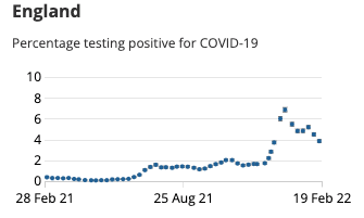 The latest ONS Coronavirus infection survey estimates the current prevalence of Covid in the community in England to be roughly 1 in 85 people, which is still very high, but at least better than the 1 in 70 a month or so ago.
